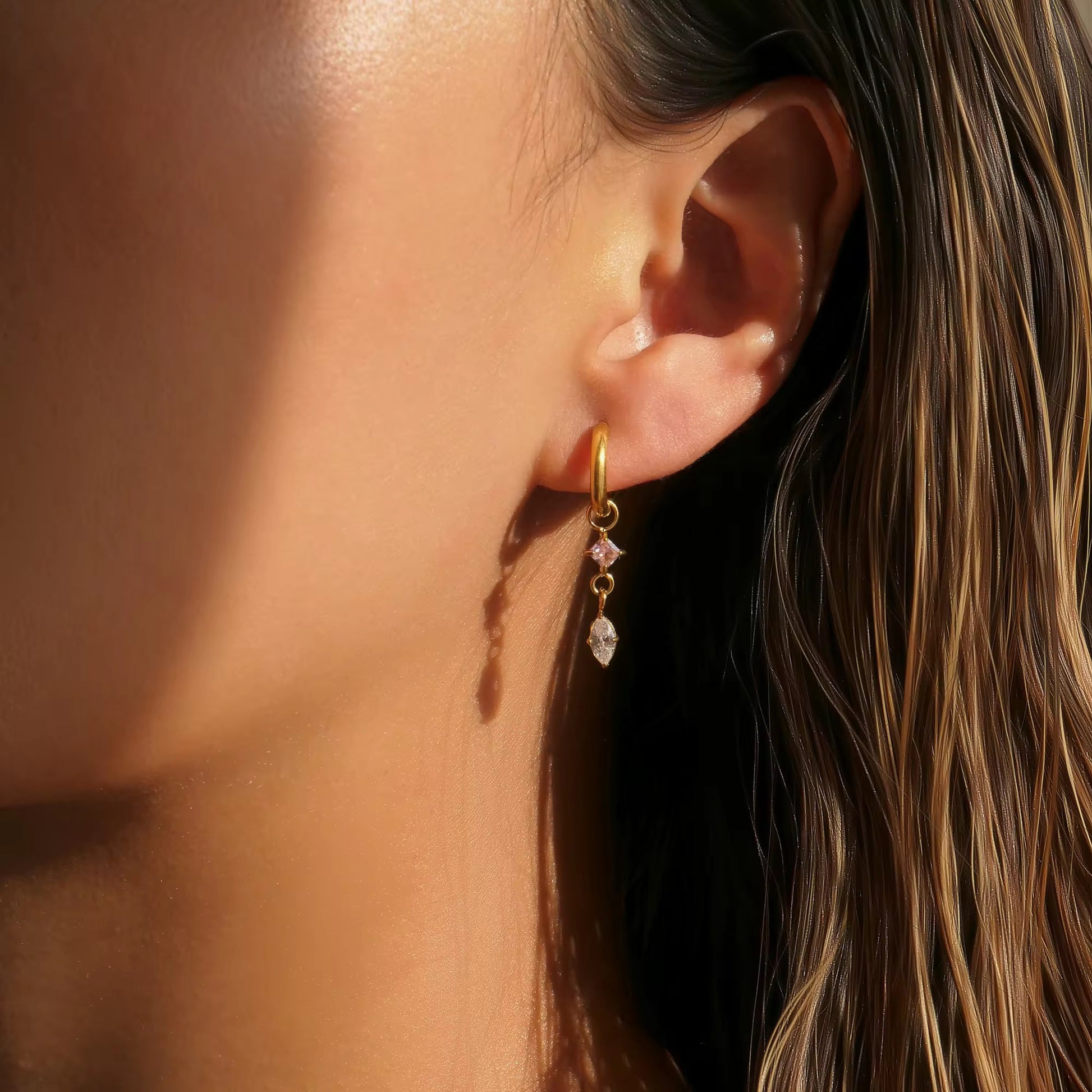 Эмнэлэгийн 316L маркийн дээд зэрэглэлийн ган төмрөн хийцтэй 18 каратын алтан бүрмэлтэй гоёмсог ээмэг. Харшил өгөх мэт хүний биед ямар нэгэн хорт нөлөө үзүүлэхгүй. Өнгөө 2-3 жил алдахгүй бөгөөд усанд норгож болно.